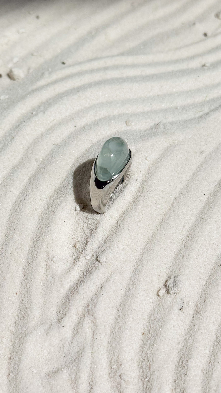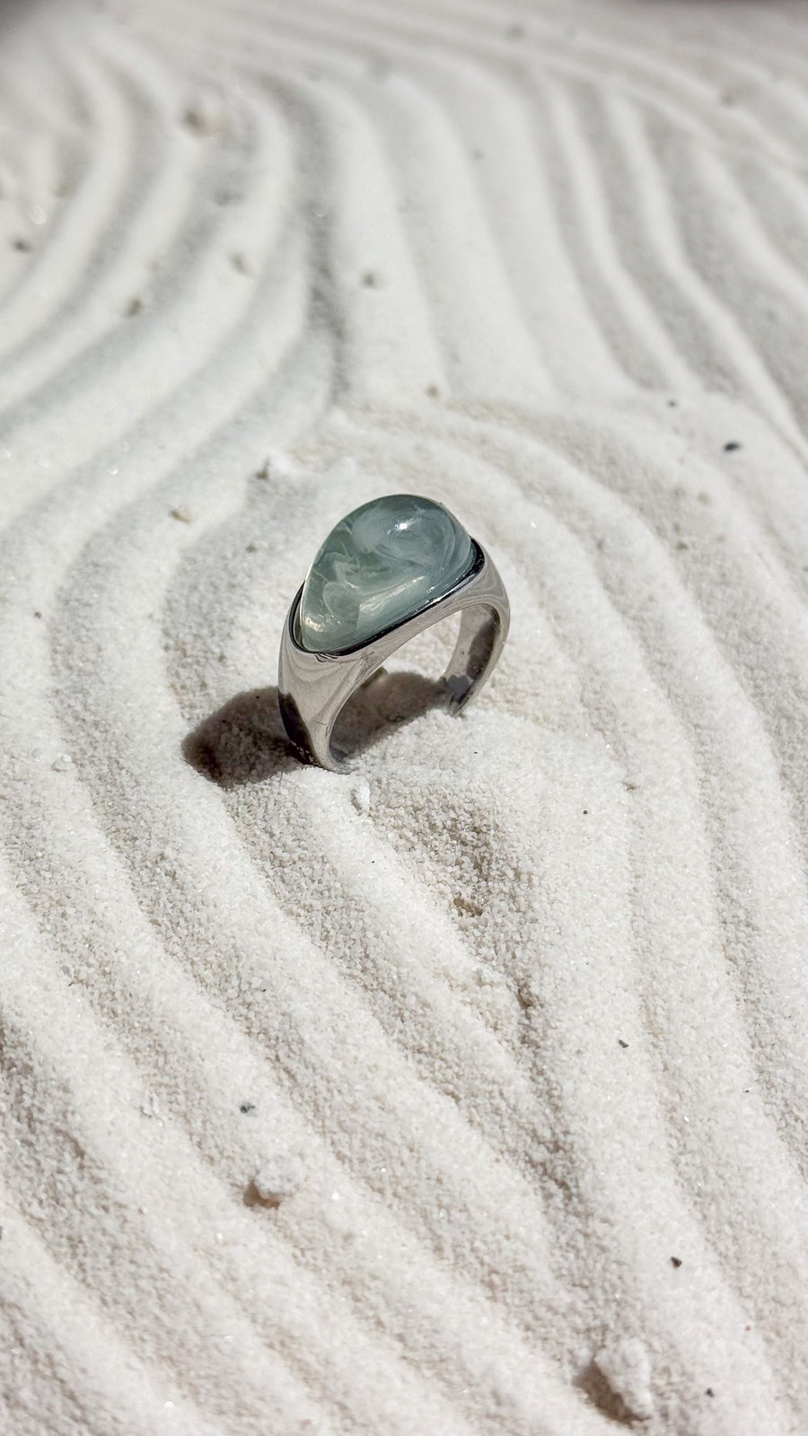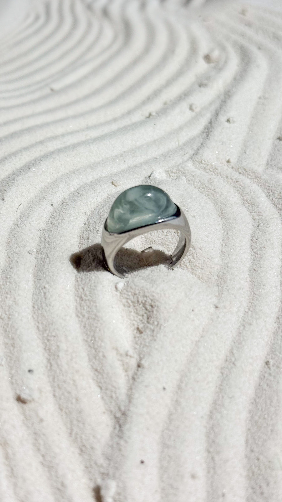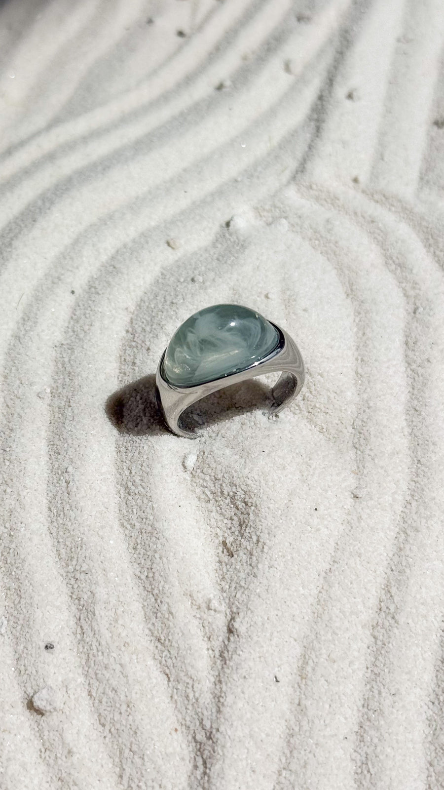 Minimal in shape, bold in presence. The Moda Ring is a modern classic, featuring a fluid silver band and a soft, ocean-hued resin top that evokes stillness and strength. Its curved silhouette is crafted to mirror the rhythm of water and the weight of intention.