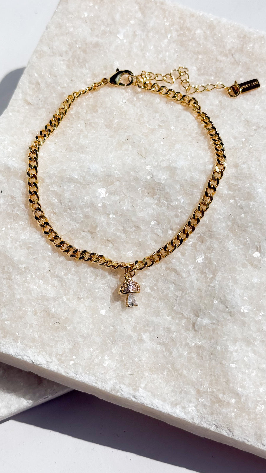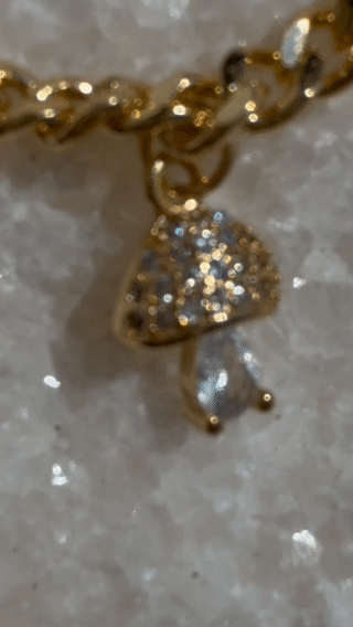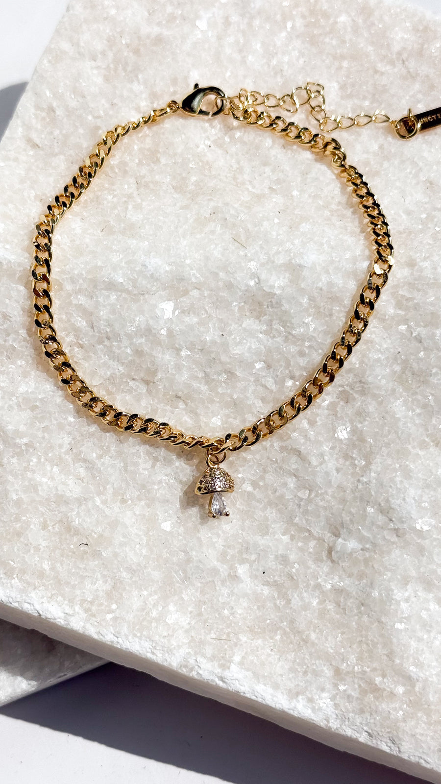 A little charm, a lot of magic. The Shroomie Anklet features a bold gold curb chain finished with an enchanting mushroom charm encrusted in CZ stones. Playful yet polished, this piece adds a whimsical edge to your everyday stack. Adjustable for the perfect fit and water-safe, as always.
